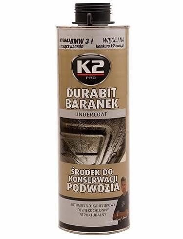 K2 Durabit — это прочное и эффективное средство для защиты днища автомобиля на основе битума и резины. Средство защищает днище и пороги от механических воздействий, таких как сколы камней, вода и соль. Оно также обладает звукопоглощающими свойствами и создает характерную текстуру.
